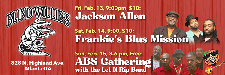 Sunday, Feb 15, 2026: ABS Gathering & Jam at Blind Willie‘s, Atlanta, 3pm-6pm, host band is the Let it Rip Band