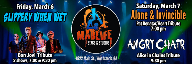 Alone & Invincible, Heart & Benatar Tribute, 7pm; Angry Chair, Alice in Chains Tribute, 9:30pm – MadLife, Woodstock