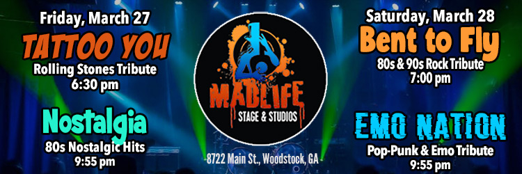 Bent to Fly, 80’s & 90’s Rock Tribute, 7pm; Emo Nation, 2000’s Pop-Punk, 9:55pm – MadLife, Woodstock
